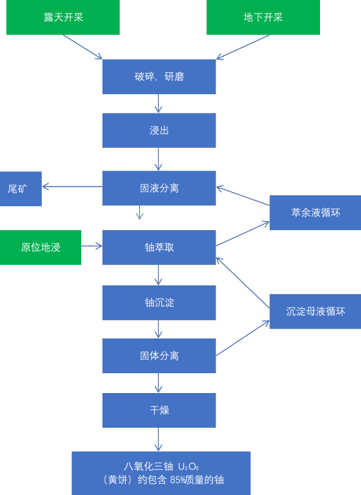 世界主要鈾礦的開采方式包括三種:原位地浸開采,露天開采及地下開采。世界約48%的天然鈾通過原位地浸開采生產(chǎn)出來,46%來自于常規(guī)開采方法(露天開采及地下開采)生產(chǎn)出來,6%作為其他礦產(chǎn)品副產(chǎn)品采出。 鈾礦開采生產(chǎn)工藝示意圖 2017年世界各國(guó)產(chǎn)鈾比例(總產(chǎn)量為59,531噸鈾) 原位地浸開采 原地浸出采鈾是將溶浸液通過注液鉆孔注入到可滲透的含礦含水層,使溶浸液在滲透過程中與鈾接觸并進(jìn)行溶解反應(yīng),生成含鈾溶液,并從抽液孔被抽至地表,輸送到車間加工處理后獲得鈾產(chǎn)品的流程。 ? 適用賦存于含水及可滲透砂巖中鈾礦物開采。 ? 圈定鈾礦的邊界品位為0.001%。 ? 根據(jù)浸出機(jī)理的不同,分為酸法和堿法開采。 開采的適用條件: (1)含礦巖性應(yīng)為具有滲透性的砂巖、砂礫巖。礦體賦存于地下水位以下的含礦含水層中。充水性和滲透性是地浸是否可行的決定性因素。 (2)礦體產(chǎn)狀平緩(傾角一般小于10度),礦體頂?shù)装鍛?yīng)是良好封閉的不透水層。 (3)礦床平米鈾量應(yīng)在最低經(jīng)濟(jì)指標(biāo)之上,含礦含水層中碳酸鹽含量>2%則不宜用酸法浸出。圍巖以長(zhǎng)石石英質(zhì)或石英質(zhì)砂巖最宜。 (4)按照目前鈾價(jià),開采礦體最大埋藏深度不宜超過400-600m。 浸出機(jī)理 酸法 主要使用硫酸作為溶浸劑,礦石中鈾隨溶浸液pH值的下降2以下后從沉淀態(tài)變?yōu)槿芙鈶B(tài),生成硫酸鈾酰溶液。含礦含水層中碳酸鹽含>2%則不適用。 堿法 主要使用碳酸氫銨作為溶浸劑,礦石中鈾隨溶浸液pH值上升到9以上后礦石中的6價(jià)鈾與碳酸鹽中的碳酸根(CO32-)絡(luò)合,生成碳酸鈾酰溶液。產(chǎn)品液鈾含量低,銨鹽也造成地下水污染。 二氧化碳+氧氣 原理是氧氣氧化礦石,在地下水中加入二氧化碳后,形成的碳酸氫根(HCO3-)離子與礦層中的鈾發(fā)生反應(yīng),使鈾溶解在溶液中,也屬于堿法浸出分類。 細(xì)菌浸出 主要選用氧化鐵硫桿菌,在浸出鈾的過程中,主要起間接催化作用,能促進(jìn)黃鐵礦和硫酸亞鐵的氧化,促進(jìn)6價(jià)鈾生成。可降低酸耗。需配合酸法使用,但并非一種獨(dú)立的浸出方法。 地浸的主要優(yōu)點(diǎn): (1)開采方法安全簡(jiǎn)單、工藝流程短。采礦階段無需搬運(yùn)、破碎礦石,水冶階段無需磨礦和固液分離,縮短了采冶工藝流程,直接生產(chǎn)成本低。 (2)礦山建設(shè)周期短、基建投資少,勞動(dòng)強(qiáng)度低、自動(dòng)化程度高,固定資產(chǎn)折舊低。 (3)環(huán)境污染小。一是抽注基本平衡,地浸溶液是在閉路管道內(nèi)循環(huán)使用,其廢水排放量顯著減少;二是放射性粉塵污染得到徹底改善;三是尾渣和廢氣的污染減到了最低程度。 露天開采即一個(gè)移走礦體上的覆蓋物,從敞露地表的采礦場(chǎng)采出鈾礦物的過程。主要適用于主礦體埋藏較淺的鈾礦床開采。 主要優(yōu)點(diǎn)包括: 1. 基建周期短。2-4年/大型 6-8月/小型。 2、開采空間大,勞動(dòng)生產(chǎn)率高。比地下開采高2-10倍。 3、礦石損失、貧化率較小。損失率3%-5%貧化率5%-8%。 4、開采成本低,勞動(dòng)條件好,生產(chǎn)安全?! ?/span> 主要缺點(diǎn): 1、開采受到氣候影響大?! ?/span> 2、基建設(shè)備投資大。 3、礦山占地多,對(duì)地表環(huán)境破壞大。 地下開采即通過開掘井巷工程從地下礦床的礦塊里采出礦石的過程,通過礦床開拓、礦塊的采準(zhǔn)、切割和回采4 個(gè)步驟實(shí)現(xiàn)。主要適用于埋藏較深及地表不允許露天開采的鈾礦床。以地壓管理方法為依據(jù),分為空?qǐng)霾傻V法充填采礦法、崩落采礦法三大類。